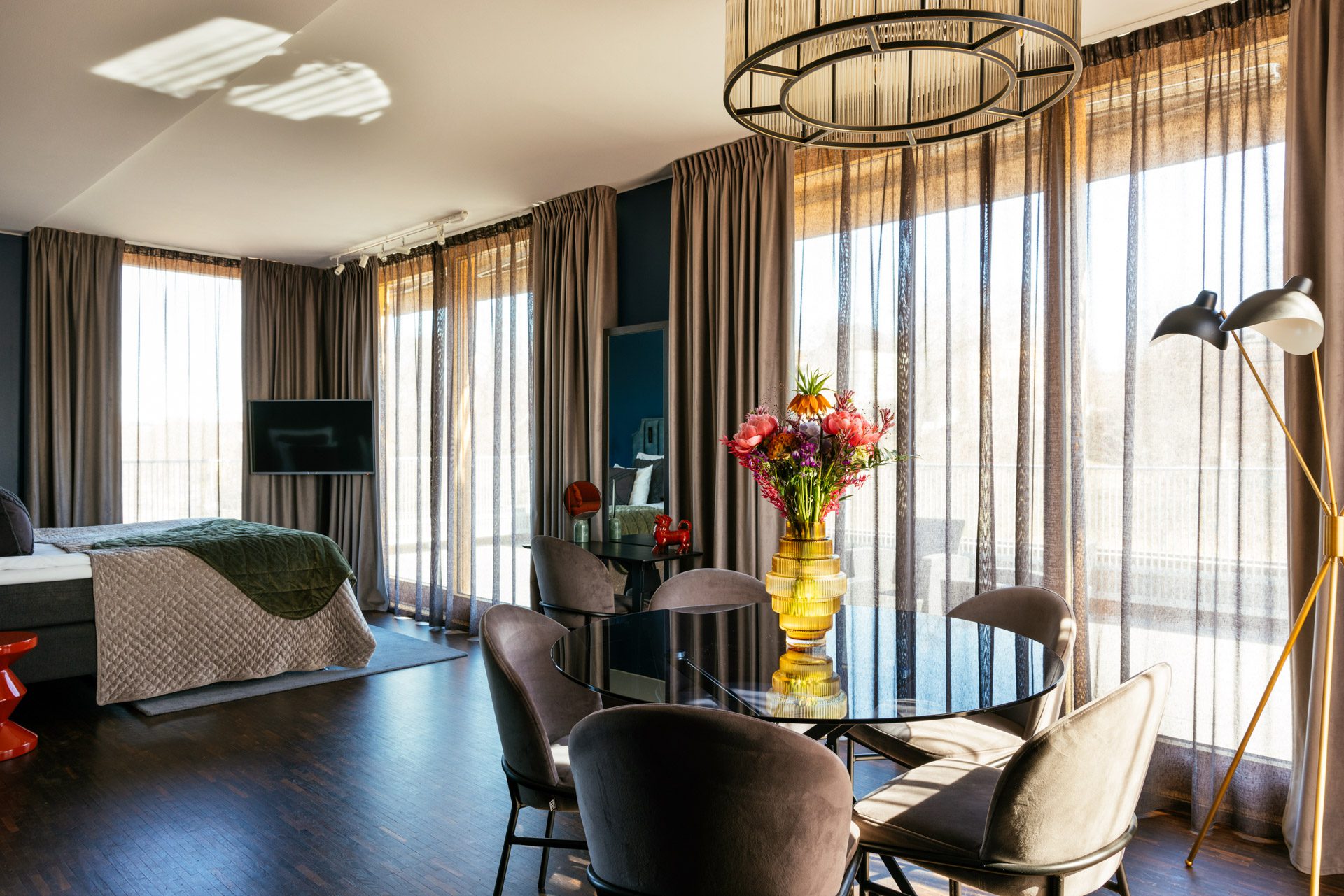 Inside, the suite includes a king-size bed and bathroom with bathtub, combining comfort with contemporary design in a well-balanced layout.